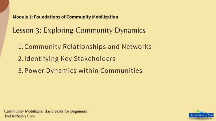 Understanding community dynamics is essential for effective mobilization. This lesson explores the importance of relationships, networks, and power structures within communities. Learning about these dynamics will help mobilizers build trust, identify influential stakeholders, and create more sustainable community programs.
